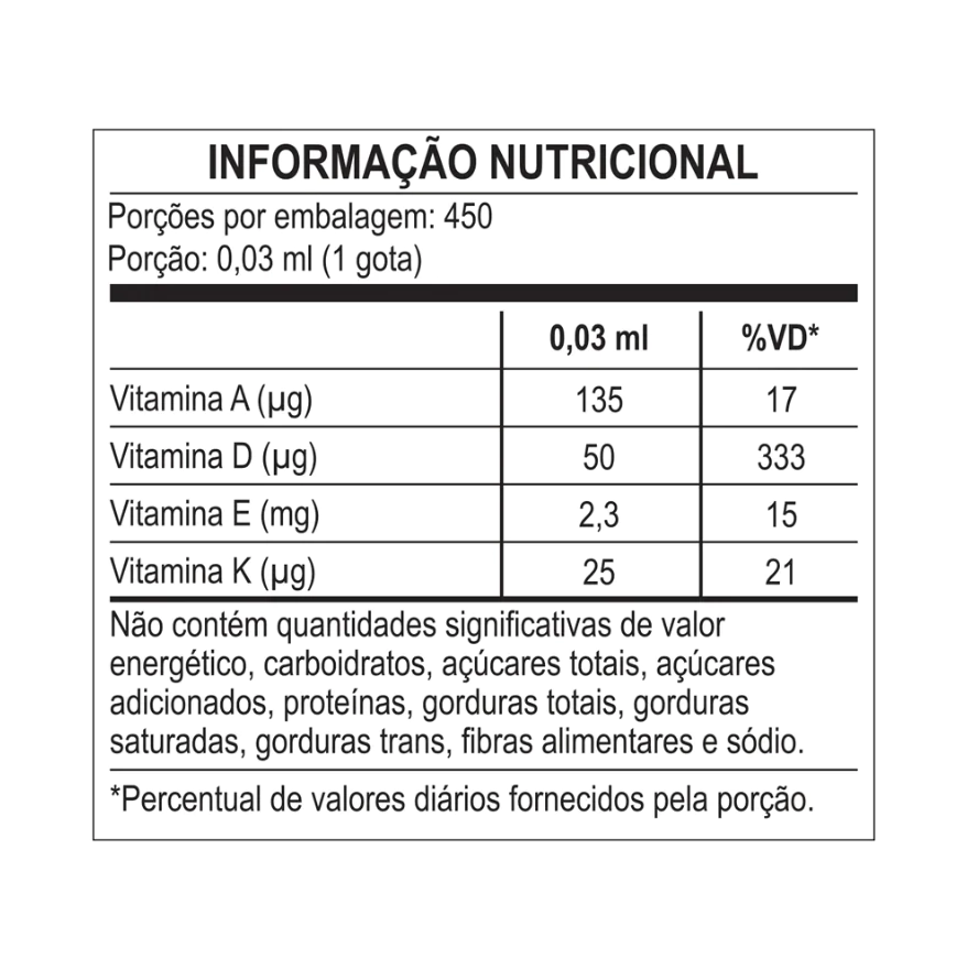 Com uma fórmula que oferece as vitaminas A, D3, E e K2 em gotas oleosas, proporciona fácil absorção e sabor agradável, facilitando o uso diário.